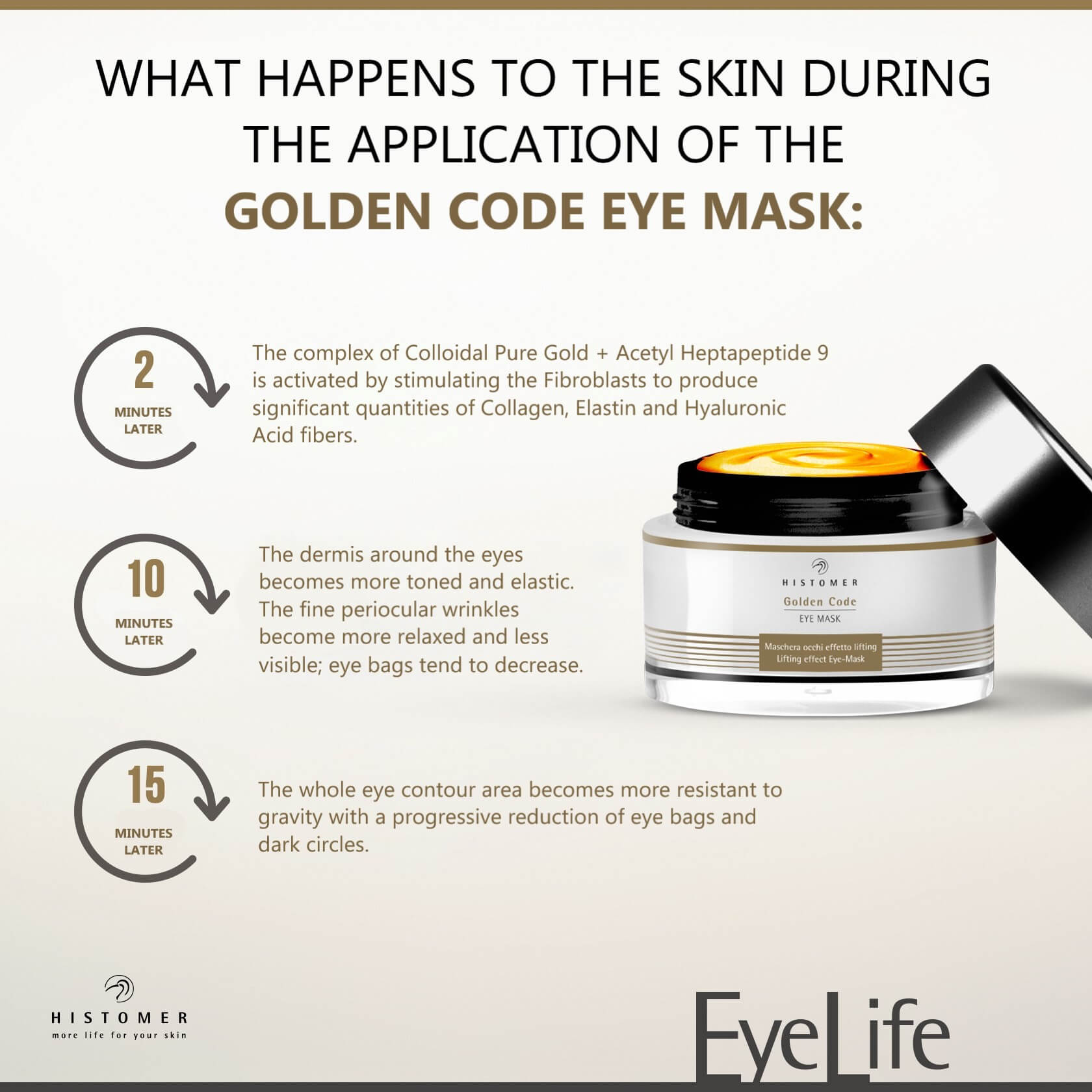 Histomer Golden Code Eye Cream reduces puffiness, dark circles, and fine lines while firming and brightening the eye area with Gold Peptides and stem cells.